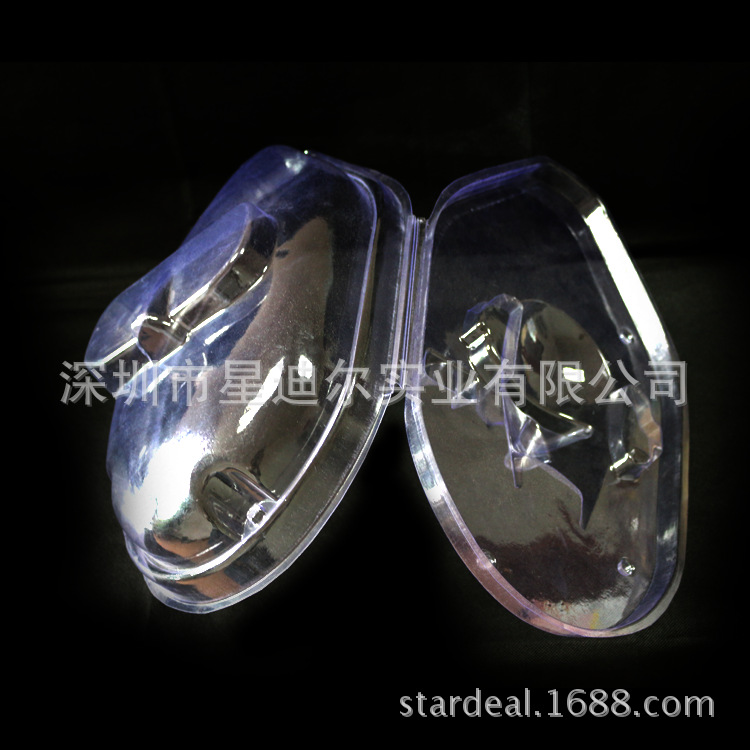 此款吸塑根据客户提供潜水眼镜及附件设计而成,为侧面对折吸塑,尺寸大,制作有一定难度。通过弧面设计,展示了眼镜的功能,附件的数量功效。商品具有层次感和立体感,提升了档次。