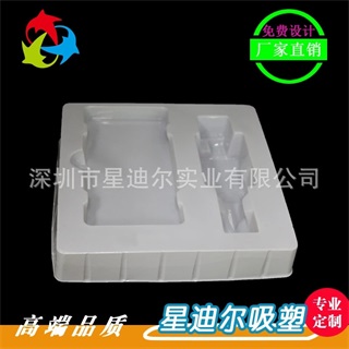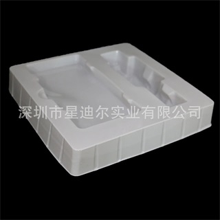 本公司按照客户提供的实物以及其他要求设计的一款白色吸塑内托,用于装手机配件——自拍杆。设计时考虑到取出产品的方便性有增加手指位,另外为了增加白色吸塑内托的强度,在四周有设计到加强骨位,从而使得整个泡壳不易变形。其主要优点有:价格实惠,相比注塑动辄几万的模具费用,吸塑模具费用简直是零头,货款在二万以上尺寸要求不严格一般不用出模具费;出货期短。从确认样板,电镀模具,到批量生产一般七天左右。