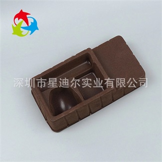 该款商品由吸塑加工厂采用植绒PS为原材料,经过吸塑工艺热成型后形成的吸塑制品,再由刀模冲切出完整的吸塑盒。定制植绒吸塑盒颜色为褐色,能够与实物形成一定的反差,可以刺激消费者的购买欲望,同时便于在销售中的展示,材质环保对环境无污染,是一款“绿色”产品。定制植绒吸塑盒采用内托的设计形式,便于放入和取出实物产品,与外包装形成一个统一的整体,具有美感。