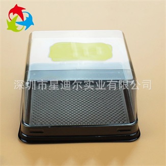 该产品是由吸塑加工厂采用PET为原材料,经过吸塑工艺热成型后形成的吸塑制品,再由刀模冲切。烘焙吸塑盒盖子颜色透明,底托为黑色,便于在销售中的展示,材质环保对环境无污染,是一款“绿色”产品。烘焙吸塑盒这种设计形式,有便于产品的放入和取出,利于产品的销售和展示。
