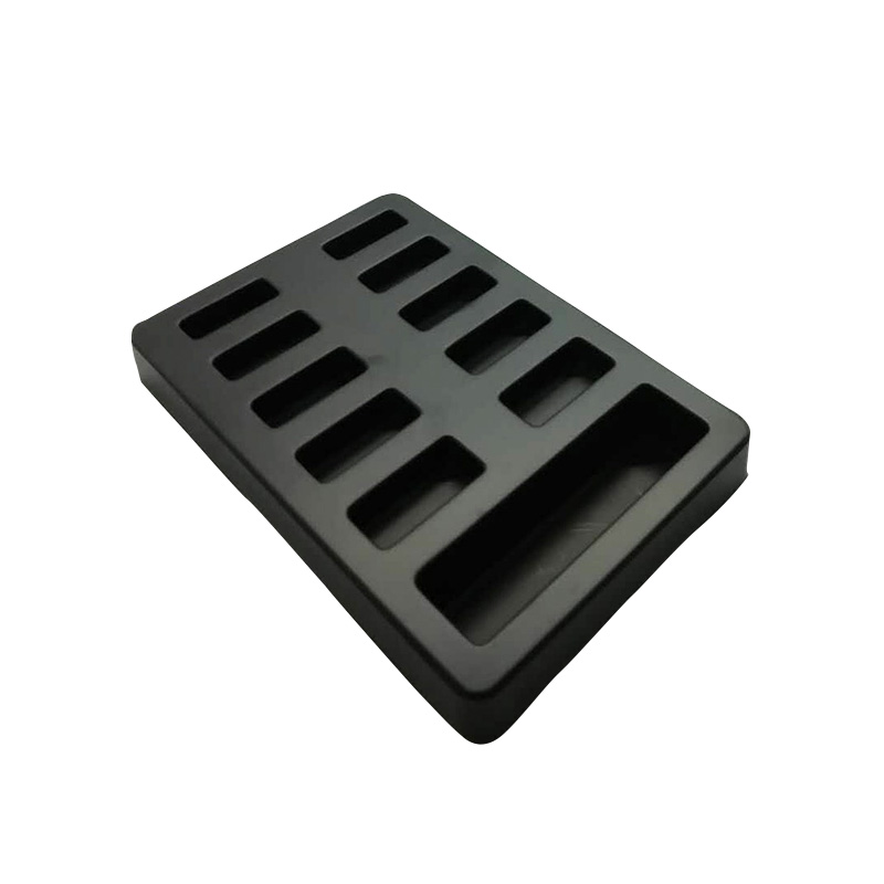 描述:本款假指甲吸塑盒是有深圳吸塑厂家根据客户实物及要求来定做的,先给客户提供图纸,确认没有问题后做模打样,确认样品后安排铜模和订料,采用环保黑色PS材料生产,可安放不同大小指甲片。